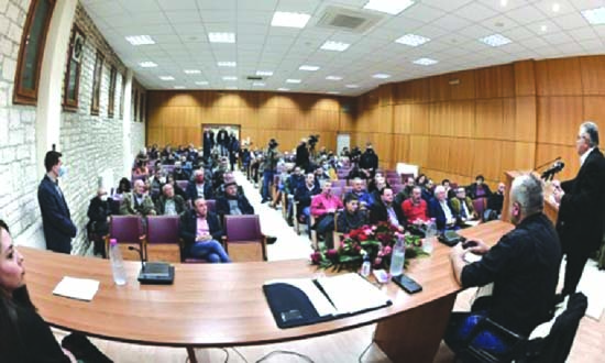 Τέλος, με συγκίνηση παρέλαβε κι ένα ξεχωριστό δώρο που είχε φιλοτεχνήσει ο γνωστός εικαστικός Τάκης Βαρελάς, έναν πίνακα με το ιστορικό γεφύρι, εργάτες και μια κόκκινη σημαία. Αργότερα, στην κατάμεστη «Πολιτεία», σ’ ένα πλήθος 370 ατόμων, μελών, φίλων και οπαδών του ΚΚΕ ο Δημήτρης Κουτσούμπας ανέπτυξε τις θέσεις του κόμματος επιτιθέμενος στους δύο μονομάχους, ΝΔ και ΣΥΡΙΖΑ.