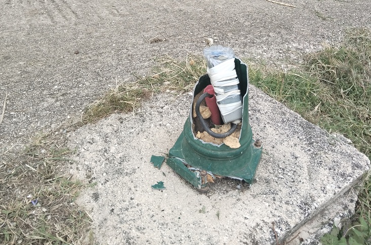 Χωρίς γνώσεις ηλεκτρολόγου, αντιλαμβάνεται κανείς ότι η κολώνα φωτισμού για άγνωστους λόγους έσπασε. Όμως αυτό που απέμεινε στη βάση της μπορεί ο οποιοσδήποτε να διαπιστώσει ότι σε καμία περίπτωση δεν μπορεί και δεν πρέπει να παραμένει έτσι σε μια πλατεία και δίπλα από παιδική χαρά.