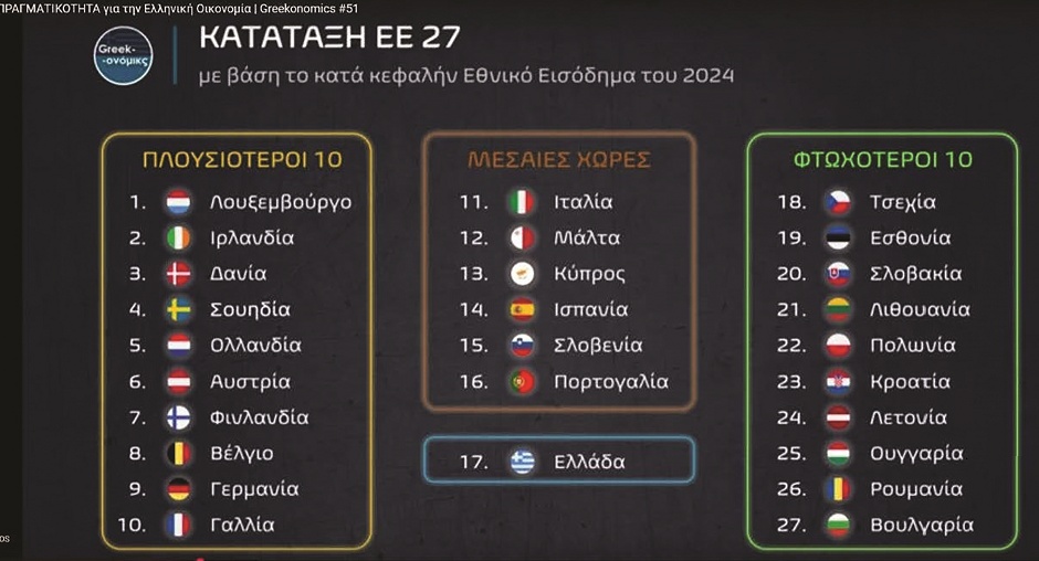 Αρχικά γίνεται η διευκρίνηση ότι πλέον η οικονομική σύγκριση της χώρας μας γίνεται αφενός με τον μέσο όρο της ΕΕ , αφετέρου με τις 10 φτωχότερες χώρες της ΕΕ και όχι με τις 10 πλουσιότερες χώρες της, για να καταλάβουμε πραγματικά που βρισκόμαστε.