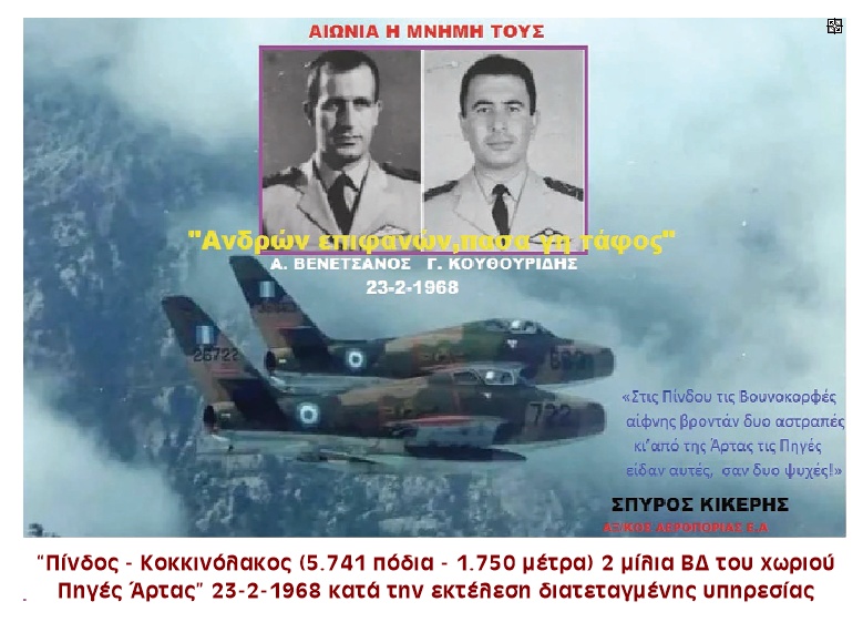 Πάνω στο καθήκον έπεσαν ο Σμηναγός Άγγελος Βενετσάνος από την Κα- λαμάτα και ο Σμηναγός Γεώργιος Κουθουρίδης από τον Καμπάνη Κιλκίς. «Η τραγική μοίρα τους – σημειώνει η Αδελφότητα – συνδέθηκε πλέον με τον τόπο μας. Ήταν δίκαιον και πρέπον νομίζουμε – έστω και αν άργησε πενήντα και πλέον χρόνια – η απότιση τιμής και δό- ξας στους Ήρωες αυτούς. Χρόνια τώρα κάναμε σχετικά αφιερώματα για το συμβάν αυτό, ενώ από το 2017 είχαμε απευθυνθεί εγγράφως σε δημόσιες αρχές και φορείς, χωρίς όμως αποτέλεσμα.