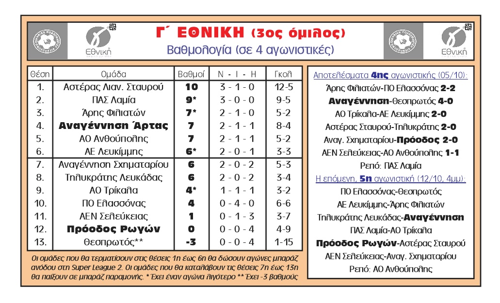 Σε αγώνα για την 4η αγωνιστική της Γ΄ Εθνικής που έγινε στο γήπεδο των Αγίων Αναργύρων, η Αναγέννηση επικράτησε εύκολα του Θεσπρωτού με 4-0 και ανέβηκε στην 4η θέση του βαθμολογικού πίνακα.