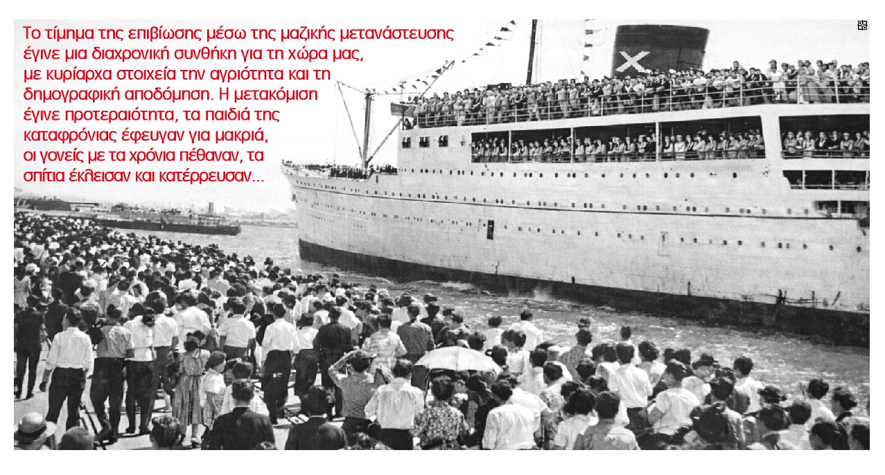 Το τίμημα της επιβίωσης μέσω της μαζικής μετανάστευσης έγινε μια διαχρονική συνθήκη για τη χώρα μας, με κυρίαρχα στοιχεία την αγριότητα και τη δημογραφική αποδόμηση. Η μετακόμιση έγινε προτεραιότητα, τα παιδιά της καταφρόνιας έφευγαν για μακριά, οι γονείς με τα χρόνια πέθαναν, τα σπίτια έκλεισαν και κατέρρευσαν. Μπορεί κάποιοι να μην πρόκοψαν όπως ήθελαν, όμως σε κάθε περίπτωση έζησαν καλύτερα στη δεύτερη πατρίδα τους και στις συνοικίες των μεταναστών. Κι είναι να αναρωτιέται κανείς σήμερα: πού εύρισκαν τα χρήματα για τα ναύλα του μεγάλου ταξιδιού, καθότι οι οικογένειές τους δεν είχαν στον ήλιο μοίρα!
