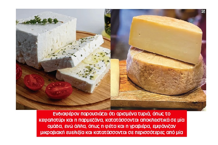 Παρατηρήθηκαν στατιστικά σημαντικές διαφορές στη βιοποικιλότητα μεταξύ των ομάδων, με την πρώτη να εμφανίζει τη μεγαλύτερη μικροβιακή ποικιλότητα. Εμβληματικές οικογένειες για την τυροκόμηση, όπως οι Lactobacillaceae και Strepto- coccaceae, διέφεραν σημαντικά ως προς τη σχετική τους αφθονία. Ενδιαφέρον παρουσιάζει ότι ορισμένα τυριά, όπως το κεφαλοτύρι και η παρμεζάνα, κατατάσσονται αποκλειστικά σε μία ομάδα, ενώ άλλα, όπως η φέτα και η γραβιέρα, εμφάνιζαν μικροβιακή ευελιξία και κατατάσσονται σε περισσότερες από μία. Ακόμη πιο εντυπωσιακό είναι ότι τυριά με διαφορετική υφή, γεύση και τεχνολογία παραγωγής μπορούσαν να ανήκουν στην ίδια μικροβιακή ομάδα, γεγονός που δείχνει ότι το μικροβίωμα υπερβαίνει τις κλασικές τεχνολογικές και γεωγραφικές κατηγοριοποιήσεις.