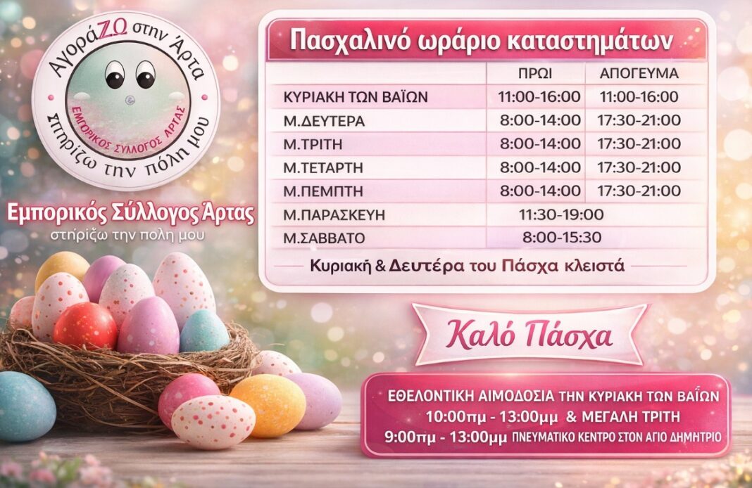 Αρχική ΚΟΙΝΩΝΙΑ Το Πασχαλινό ωράριο λειτουργίας των καταστημάτων της Άρτας ΚΟΙΝΩΝΙΑ Το Πασχαλινό ωράριο λειτουργίας των καταστημάτων της Άρτας Από Ταχυδρόμος - 1 Απριλίου, 2026 μερίδιο FacebookTwitterΤυπώνωEmailViberWhatsAppPinterest Το Πασχαλινό ωράριο λειτουργίας των καταστημάτων της Άρτας ΠΑΡΟΜΟΙΑ ΑΡΘΡΑΠΕΡΙΣΣΟΤΕΡΑ ΑΠΟ ΤΟΝ ΔΗΜΙΟΥΡΓΟ Ευχαριστίες από Άννα Μπατιστάτου για την εκλογή της στο Συμβούλιο Διοίκησης – Διεκδικεί εκ νέου την θέση πρυτάνεως Δήμος Αρταίων. Δωρεάν προληπτικές εξετάσεις σε δέκα χωριά Δήμος Πρέβεζας. Έτοιμο το καταφύγιο αδέσποτων ΑΦΗΣΤΕ ΜΙΑ ΑΠΑΝΤΗΣΗ Ακύρωση απάντησης εισάγετε το σχόλιό σας! παρακαλώ εισάγετε το όνομά σας εδώ έχετε εισάγει εσφαλμένη διεύθυνση ηλεκτρονικού ταχυδρομείου! παρακαλώ εισάγετε εδώ την ηλεκτρονική σας διεύθυνση αποθηκεύστε το όνομα, το ηλεκτρονικό ταχυδρομείο και τον ιστότοπό μου σε αυτό το πρόγραμμα περιήγησης για την επόμενη φορά που θα σχολιάσω.